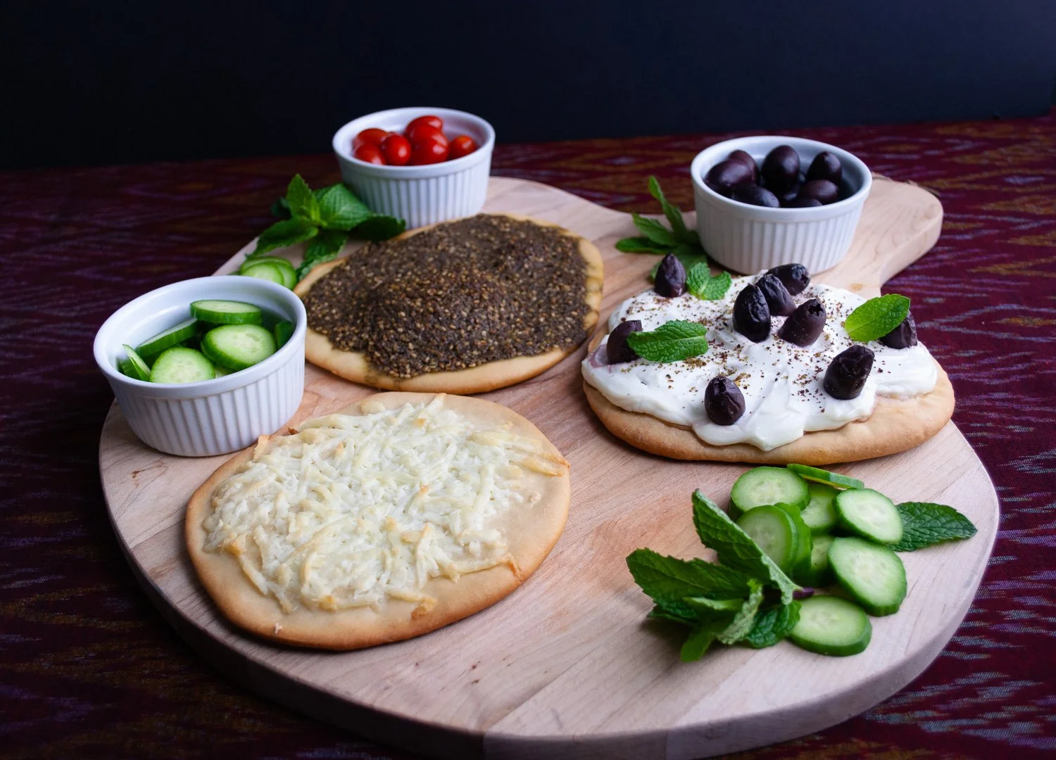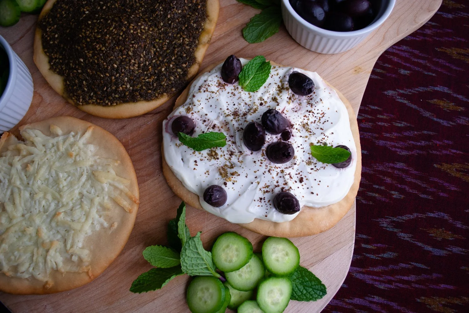 Manakeesh (alternate spellings: Manakish or Manaqish) are sometimes referred to as Middle Eastern Pizza, they are basic flatbreads with a range of tasty toppings and are infinitely adaptable. Our standout favorite of this batch was the labneh with olives. It is warmed briefly in the oven and is creamy, tangy, crunchy and oh so good.