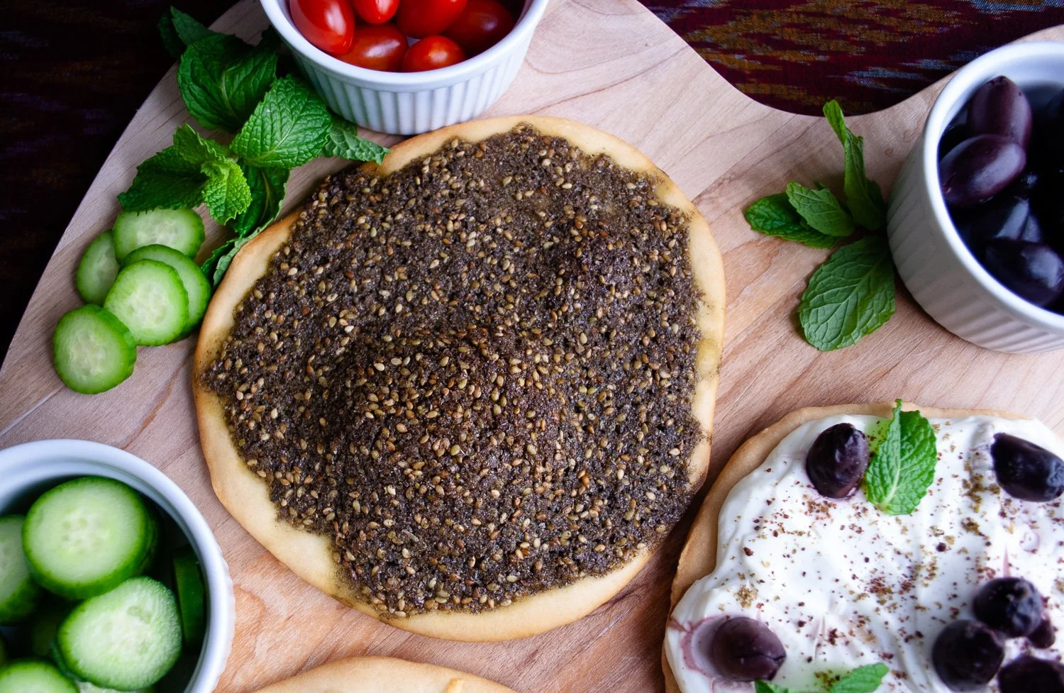 Place 1-2 tablespoons of Za’atar spread (equal parts Za’atar seasoning and olive oil) on each unbaked flatbread and use the back of a spoon to spread evenly. Place on the prepared baking sheet. Bake in the preheated oven for 10-12 minutes, until the dough becomes light golden in color and puffs slightly.